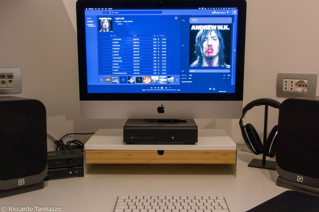 Il solo iMac occupa gran parte della superficie della scrivania (IKEA LINNMON 120×120), aggiungete le casse (ho optato per le Q Acoustics 3010 per tre motivi: ingombro ridotto al minimo, scuola inglese, tweeter in seta) e capirete che lo spazio dedicabile all’amplificazione del sistema non può avere dimensioni “standard”. Prima di installare Gjallarhorn utilizzavo, con moderata soddisfazione, il Fosi Audio V3 ma, di fatto, non ne sono mai stato soddisfatto appieno: avere due stadi di preamplificazione in cascata non mi ha mai fatto impazzire come idea e l’inserimento di un selettore linea tra Modi+ e le amplificazioni, strada intrapresa, risolveva la questione ma era anche poco armonica dal punto di vista di ingombri ed estetica.