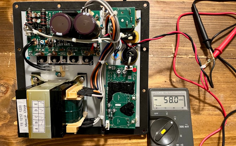 Ho quindi aperto il sub, smontato la piastra comandi/amplificazione, e verificato col tester: il finale satura alla tensione di alimentazione negativa…